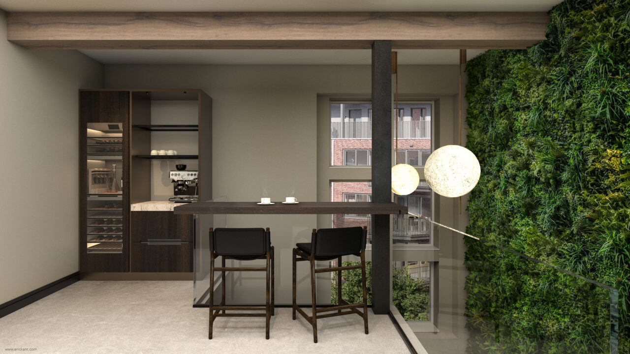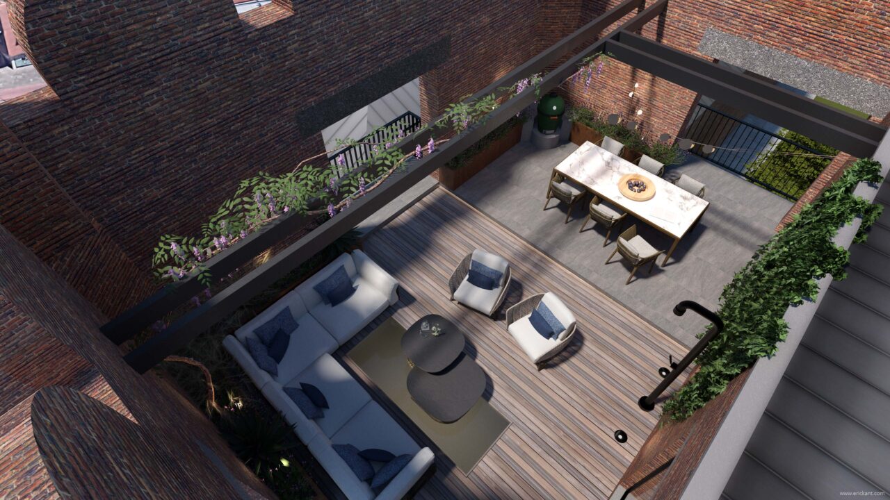 In addition to the rooftop terrace with built-in pantry, the apartment boasts several standout features, including a luxurious home office for working in style, a comfortable living room for ultimate relaxation, and an atmospheric master bedroom with an ensuite bathroom.