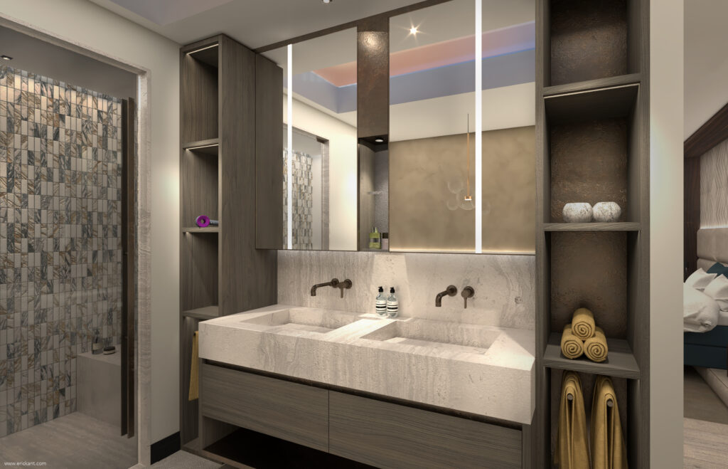 The interior is a harmonious blend of various types of natural stone, dark wood and green accents, creating a warm and calming atmosphere.