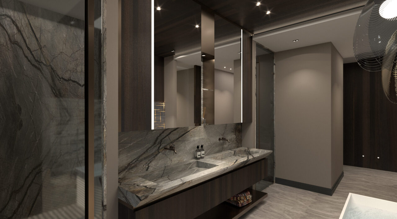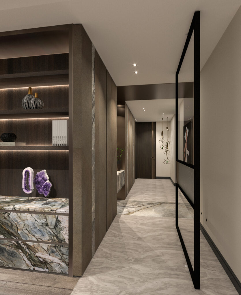The interior exudes a sense of class and tranquility in which natural stone, smoked oak and green accents form the basis. The high-quality finish of the interior is emphasized by carefully placed lighting, which not only brings atmosphere but also accentuates the architectural lines and materials.