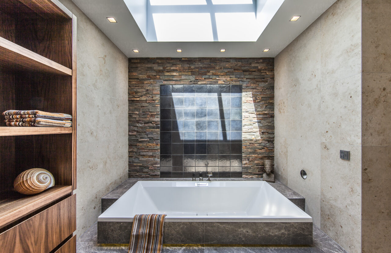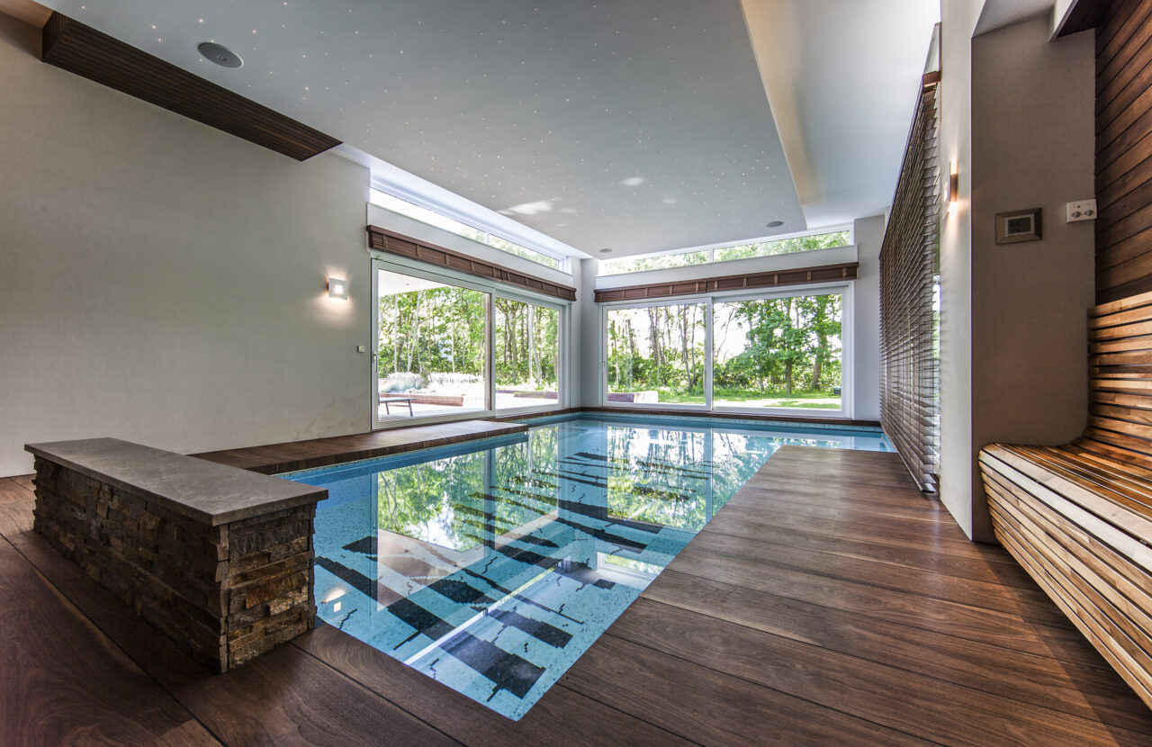 The material selection focuses on natural and sustainable elements that add warmth and ambiance. A wooden floor surrounds the pool, creating an inviting and safe environment. In the sauna and fitness area, breathable materials have been used to promote a healthy indoor climate. This is making the wellness space not only luxurious but also highly functional and comfortable.