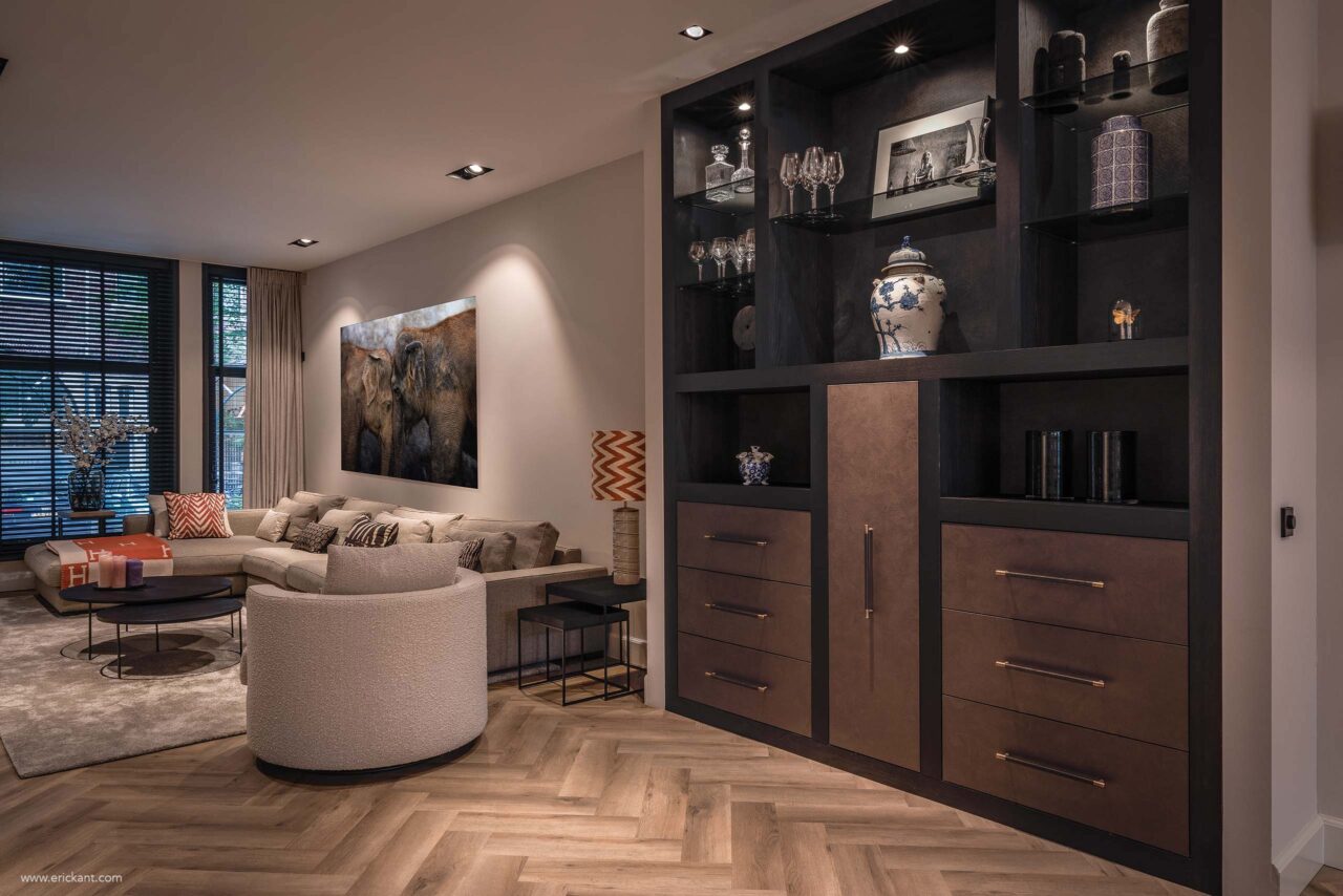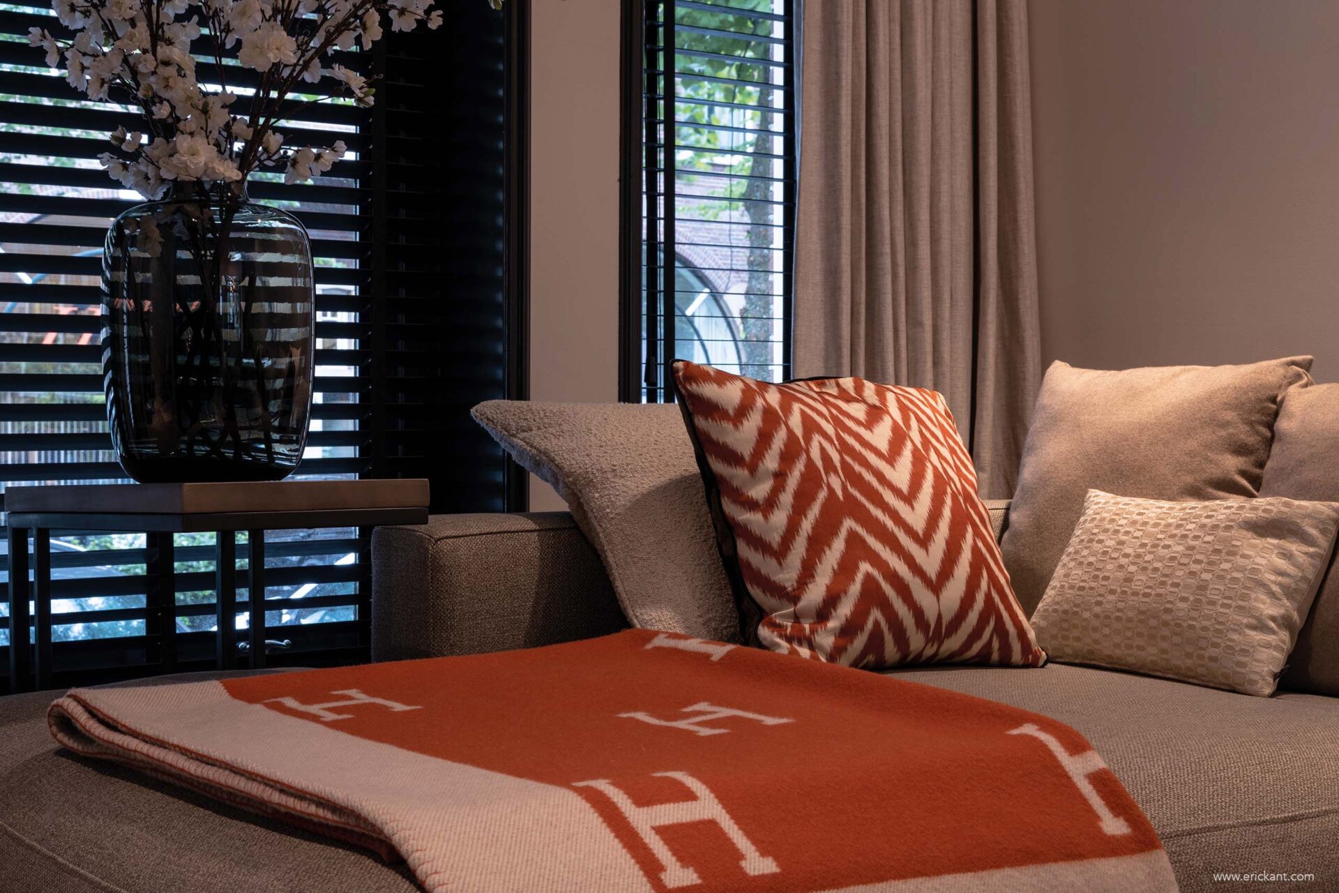 A harmonious mix of materials and tones was chosen to convey both warmth and sophistication. The light-colored walls provide a calm base, while the Hungarian point-patterned wooden flooring adds character and rhythm to the interior. In the kitchen, tiles have been used for both functionality and contrast. Black window frames and doors lend the home a modern edge. Beige tones dominate the living area, complemented by subtle orange accents such as cushions and throws, which add a feminine, contemporary touch.