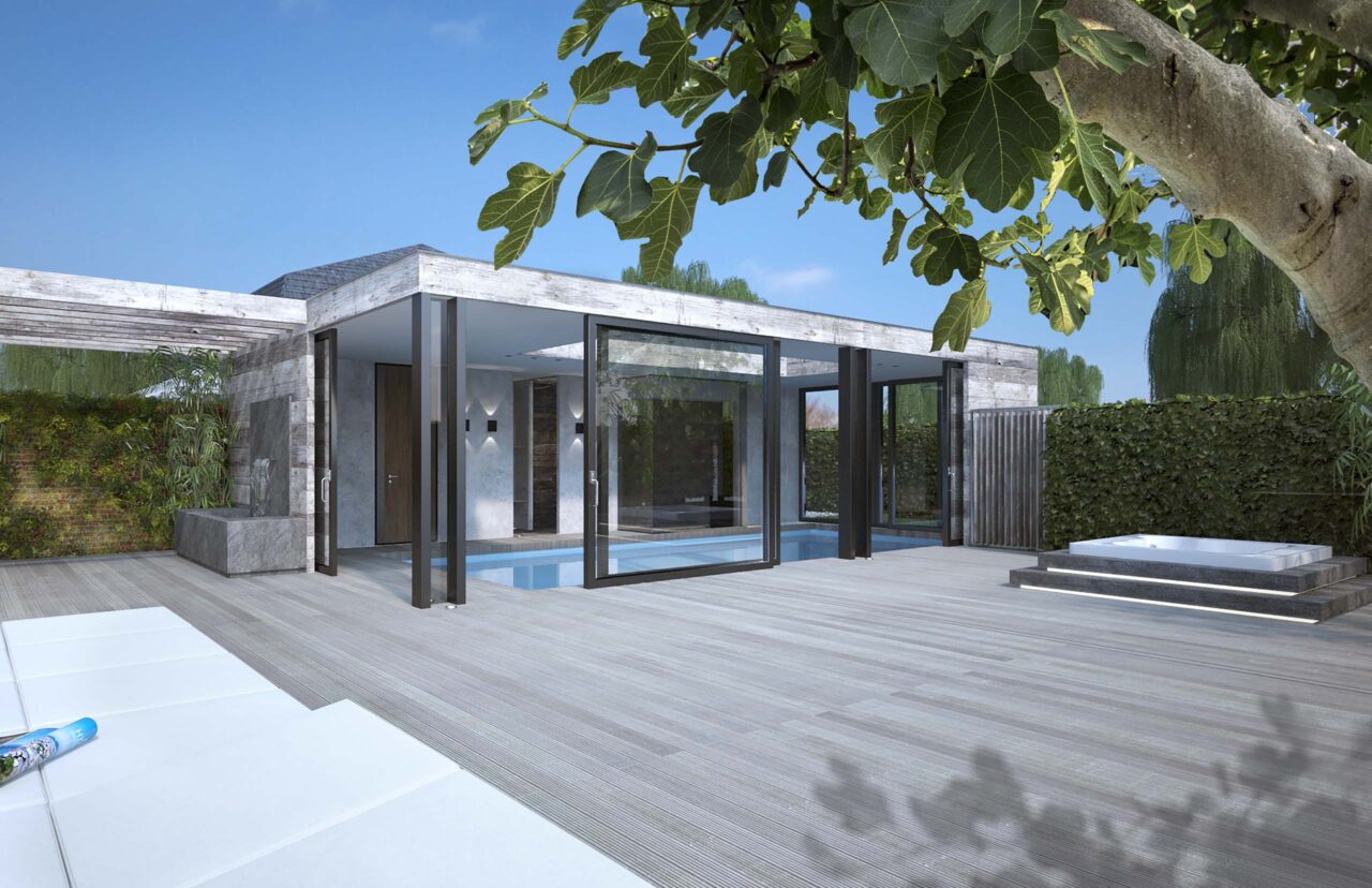 The interior of the poolhouse exudes premium luxury. The large sliding doors open seamlessly to the garden while the spacious canopy ensures you’re always sheltered, regardless of the season. A skylight above the poolhouse fills the space with natural daylight and emphasizes the clean modern design. Subtle and carefully designed lighting creates an intimate and serene ambiance as evening falls. The freestanding jacuzzi adds an extra dimension to the wellness experience, making this outdoor retreat a true sanctuary for relaxation and rejuvenation.