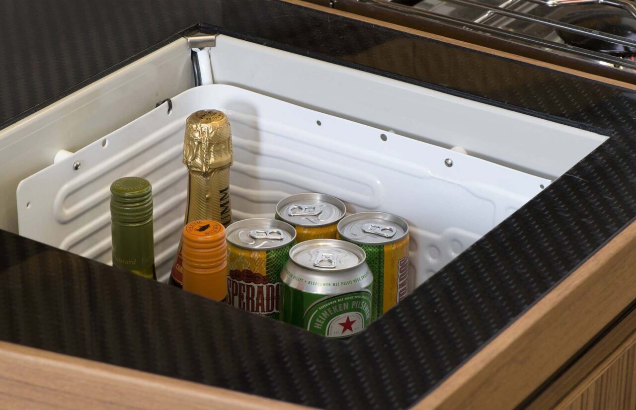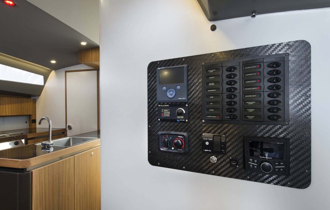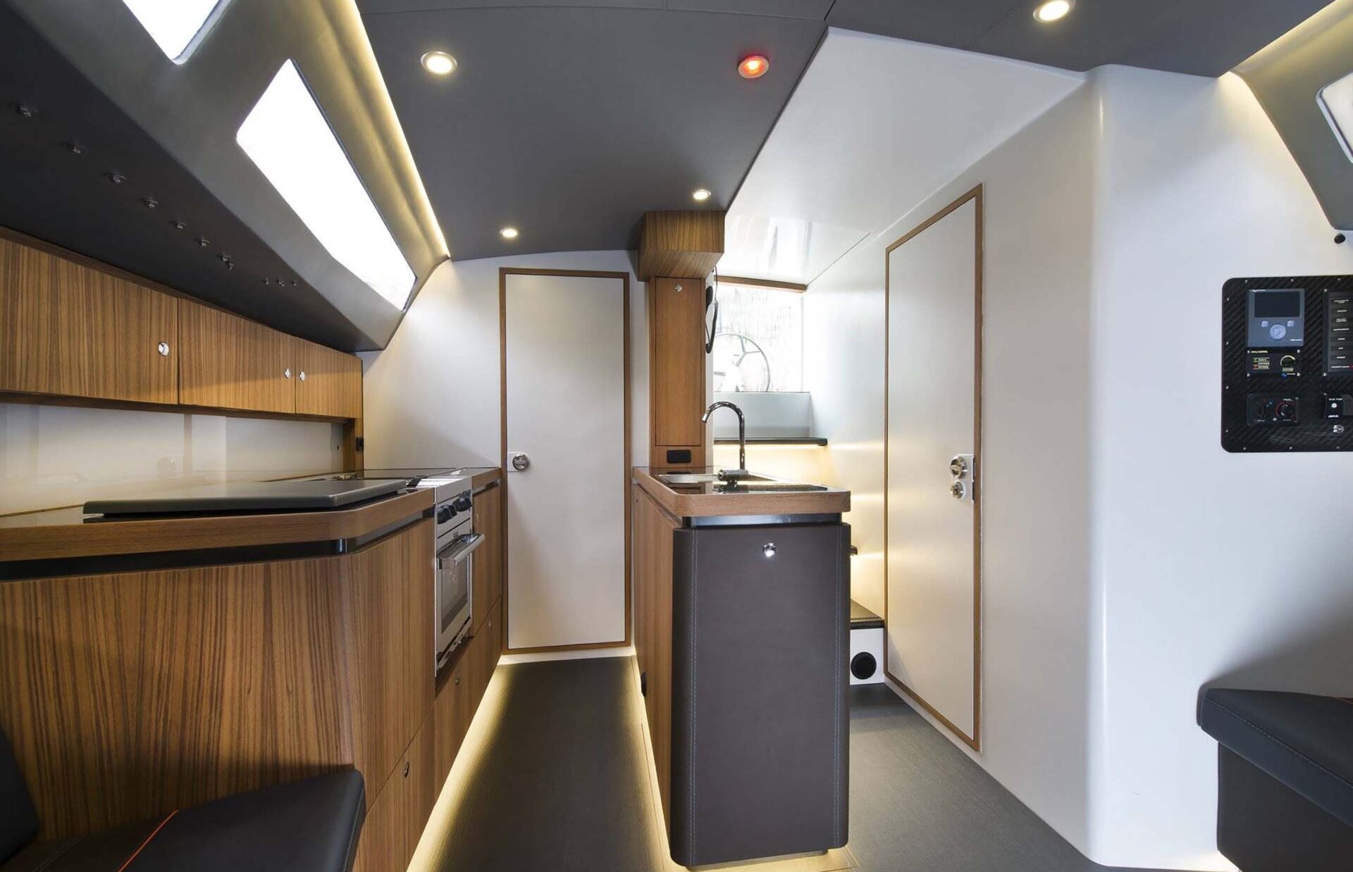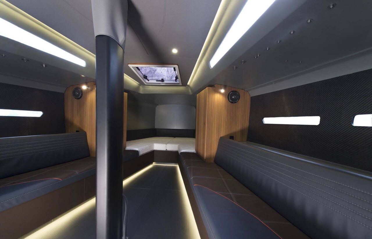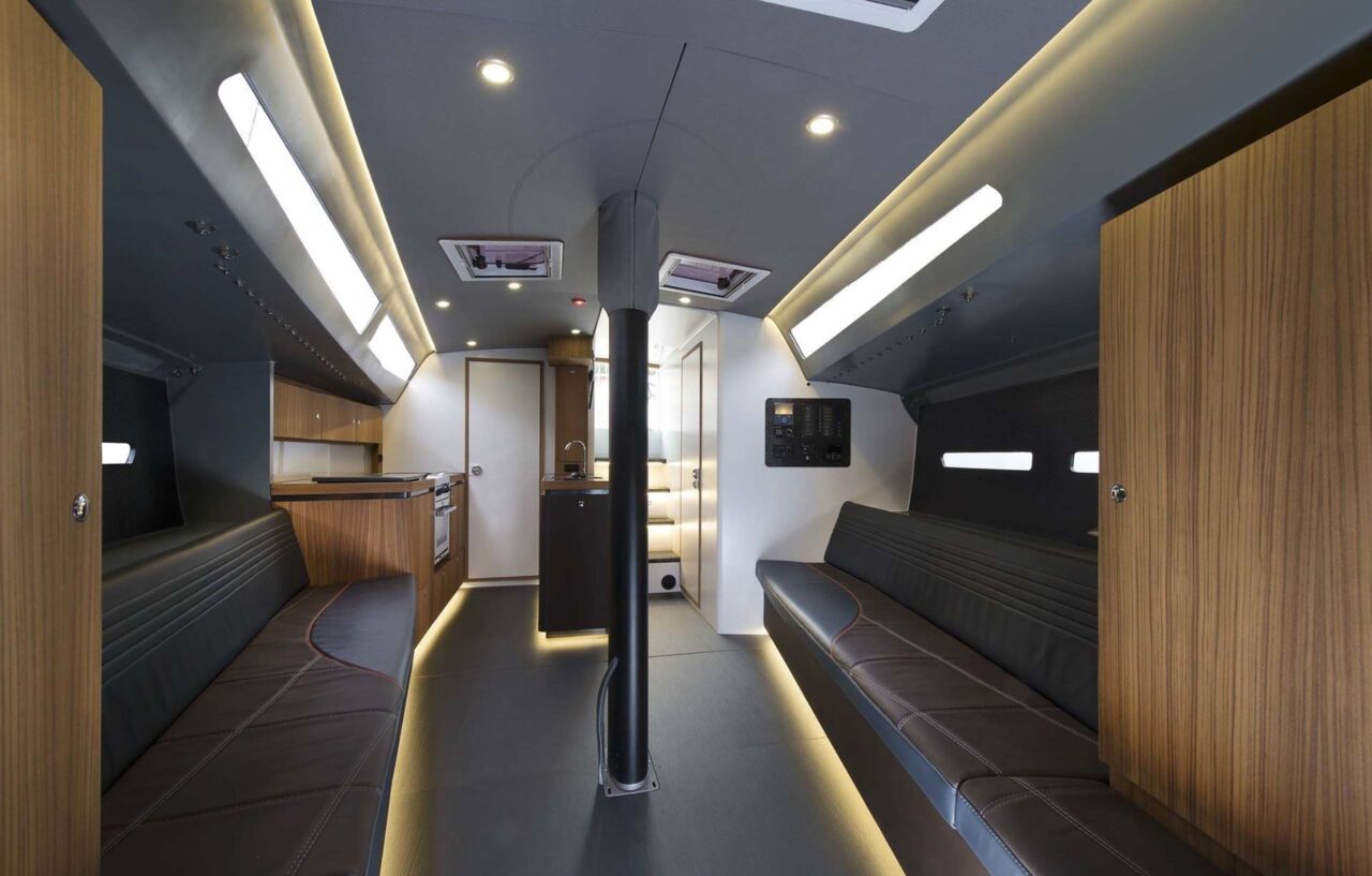 Wat betreft de materiaalkeuze is er bewust gekozen voor lichtgewicht oplossingen zonder in te boeten aan uitstraling en kwaliteit. Het gebruik van teak fineer op een honingraad sandwichplaat zorgt voor een natuurlijke, warme sfeer, terwijl het volledige interieur met carbon composieten licht en duurzaam blijft. Deze combinatie garandeert een perfect evenwicht tussen prestaties en comfort aan boord.