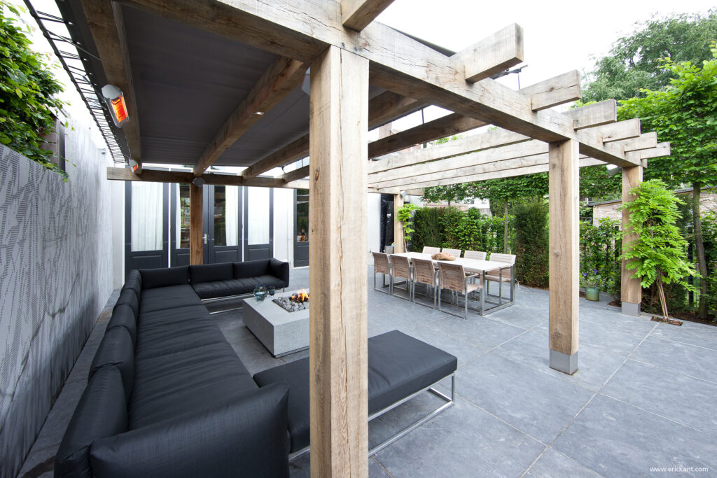 De materialisatie is warm en natuurlijk, met duurzame houtsoorten, keramische tegels en een ingetogen kleurenpalet. De combinatie van luxe tuin architectuur en moderne outdoor meubelen maakt dit project een voorbeeld van high end outdoor design. De verlichting is subtiel verwerkt in de structuur en zorgt ’s avonds voor een intieme sfeer waarin materialen, texturen en beplanting tot hun recht komen.