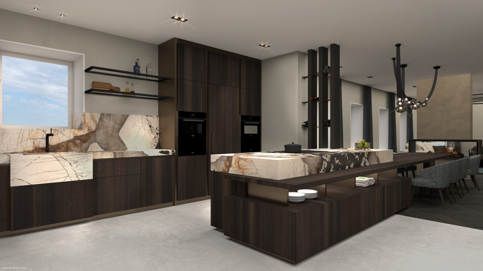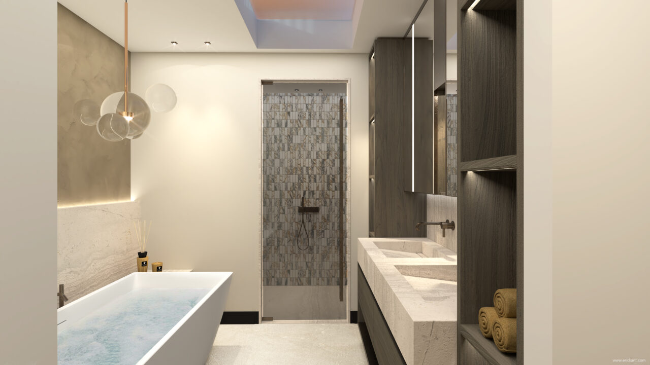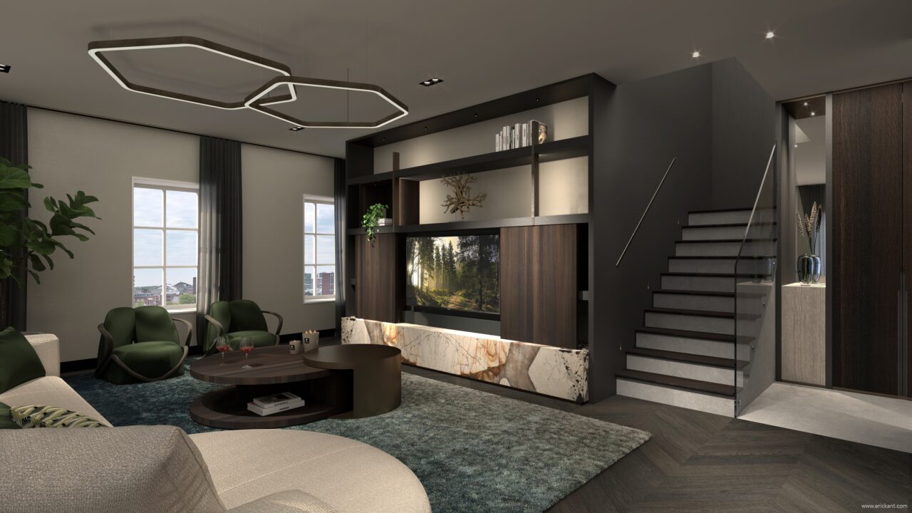 Het interieur is een harmonieuze mix van verschillende soorten natuursteen, donker hout en groene accenten, die een warme en rustgevende sfeer creƫren.