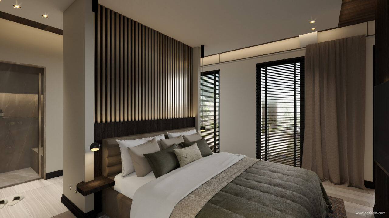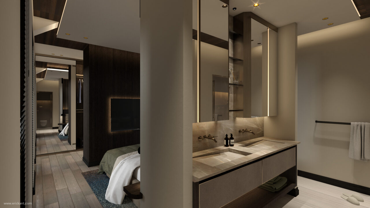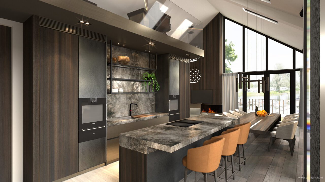 De materiaalkeuze in dit penthouse versterkt het warme en tijdloze karakter van de woning. Hout speelt een prominente rol, van vloer tot maatwerkmeubilair, en brengt een natuurlijke zachtheid in balans met de strakke architectuur. De keuken is afgewerkt met natuursteen, wat niet alleen elegant oogt, maar ook staat voor duurzaamheid en kwaliteit. Alles ademt aandacht voor detail en een verfijnde smaak.