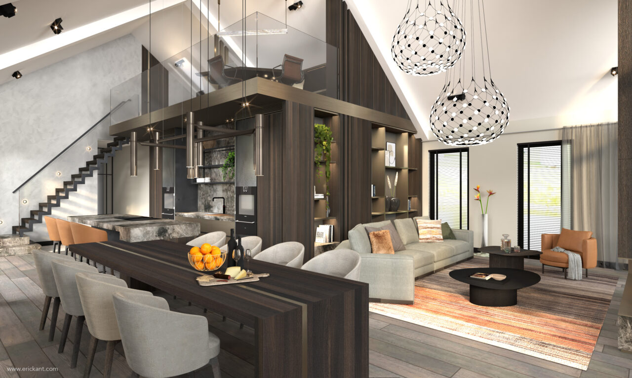 Wat deze woning echt bijzonder maakt, zijn de unieke elementen in het interieur. De vide met een stijlvolle werkkamer zorgt voor een open en luchtige sfeer, terwijl het hoge plafond met dakramen het licht prachtig door de ruimte laat stromen. Oranje accenten in het textiel geven het interieur een warme, levendige uitstraling zonder te overheersen. Elk detail is zorgvuldig gekozen om een harmonieuze en moderne leefomgeving te creƫren.