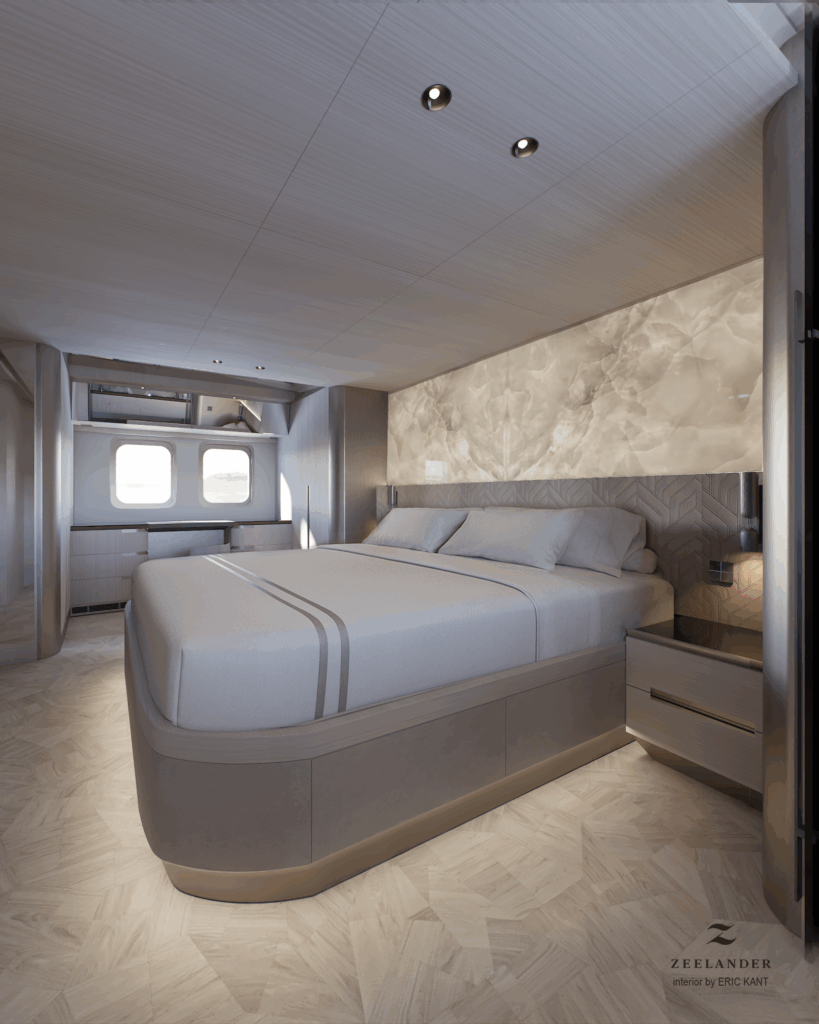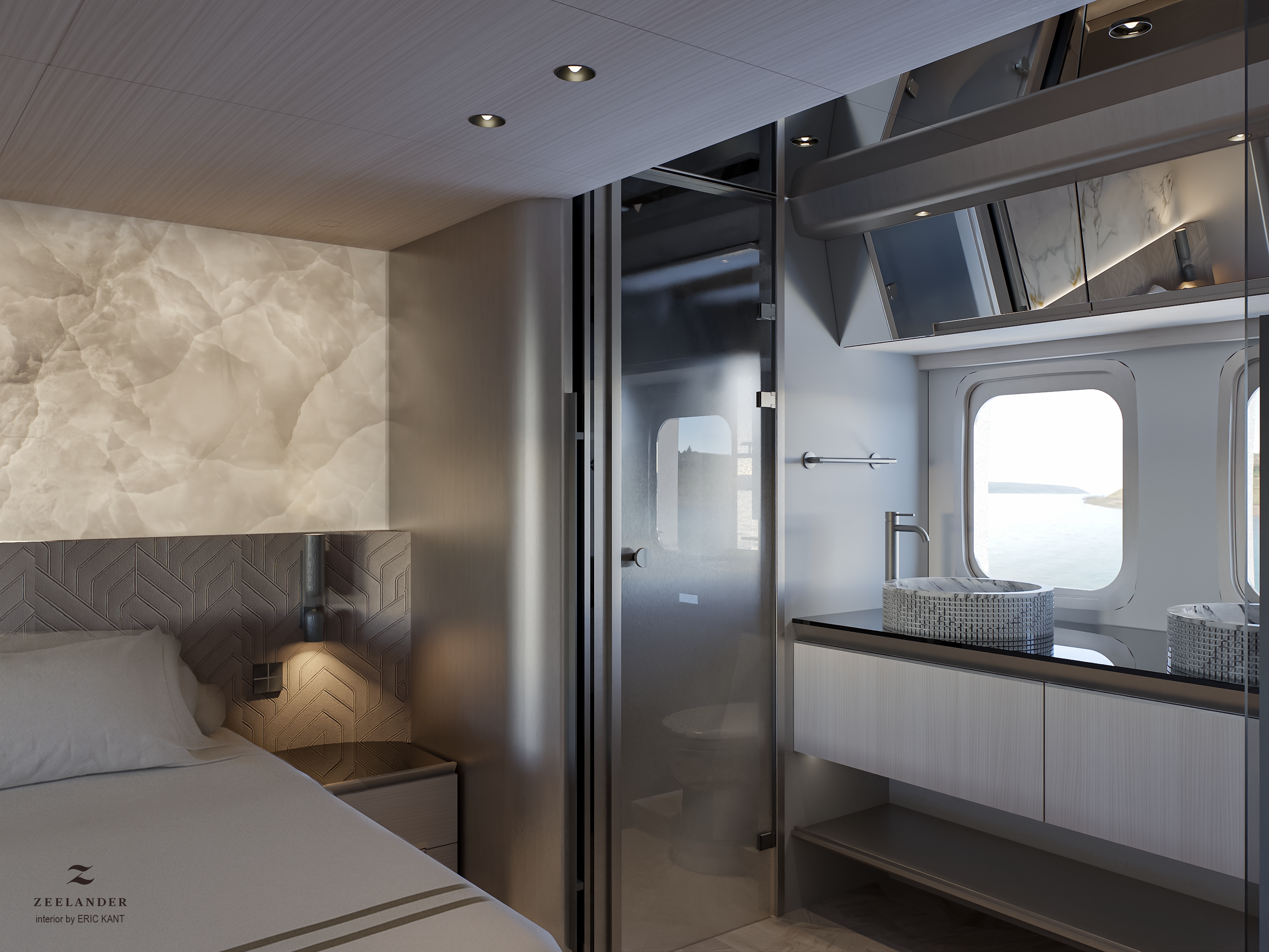 Het interieur voor deze Zeelander 8, ontworpen door ERIC KANT contemporary design, belichaamt de essentie van luxe op het water. Elk detail is zorgvuldig ontworpen om comfort, elegantie en verfijning te combineren in een harmonieus geheel. De zachte contouren, subtiele indirecte verlichting en het gebruik van panoramische ramen zorgen voor een serene beleving tijdens elke vaartocht. De ruimte weerspiegelt de balans tussen modern design en tijdloze klasse, een plek waar vorm en functie samenkomen om een unieke jachtervaring te creëren.