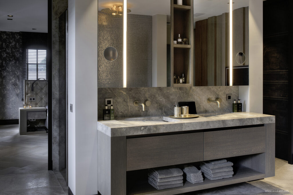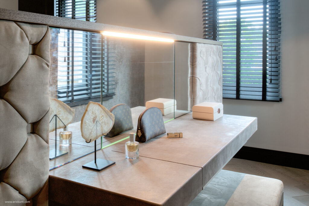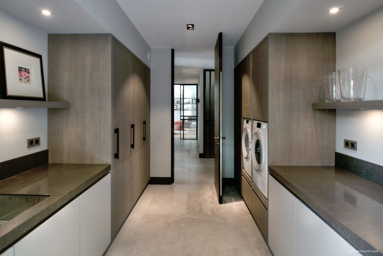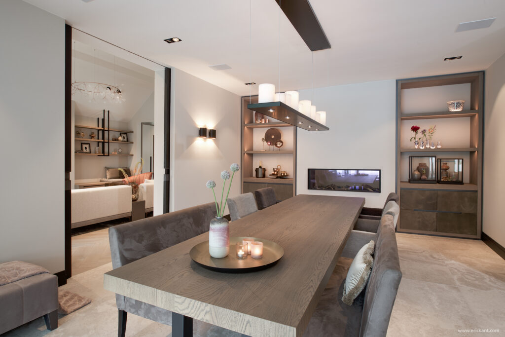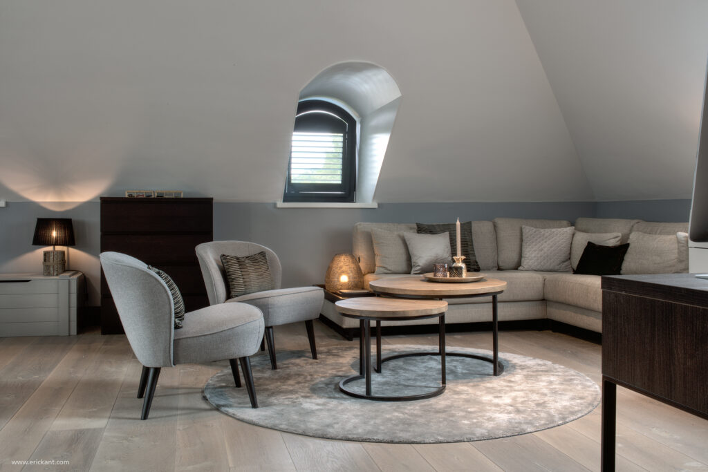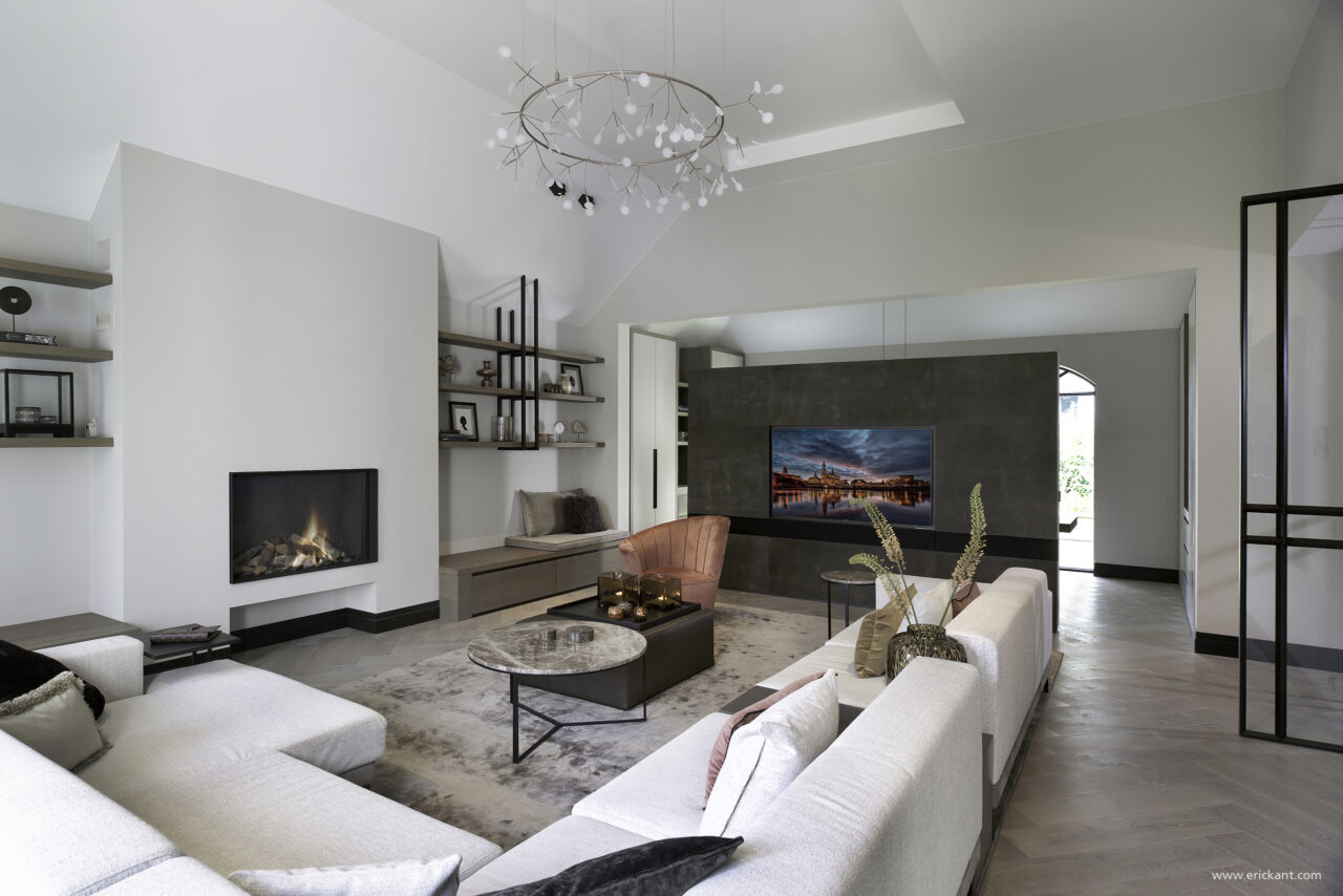 In het interieur is een balans gecreƫerd tussen zacht en stoer. Natuursteen en hout geven warmte en structuur, leer en staal voegen een moderne, robuuste touch toe, terwijl de ronde vormen en zachte stoffen de ruimtes zachtheid en comfort geven. Deze combinatie van materialen zorgt voor een dynamisch geheel: iedere keuze voegt karakter toe en benadrukt het luxe, maar toch toegankelijke gevoel van het huis. Het lichte kleurenpalet van wit en licht hout versterkt de frisse, open uitstraling en laat de materialen en accenten volledig tot hun recht komen.