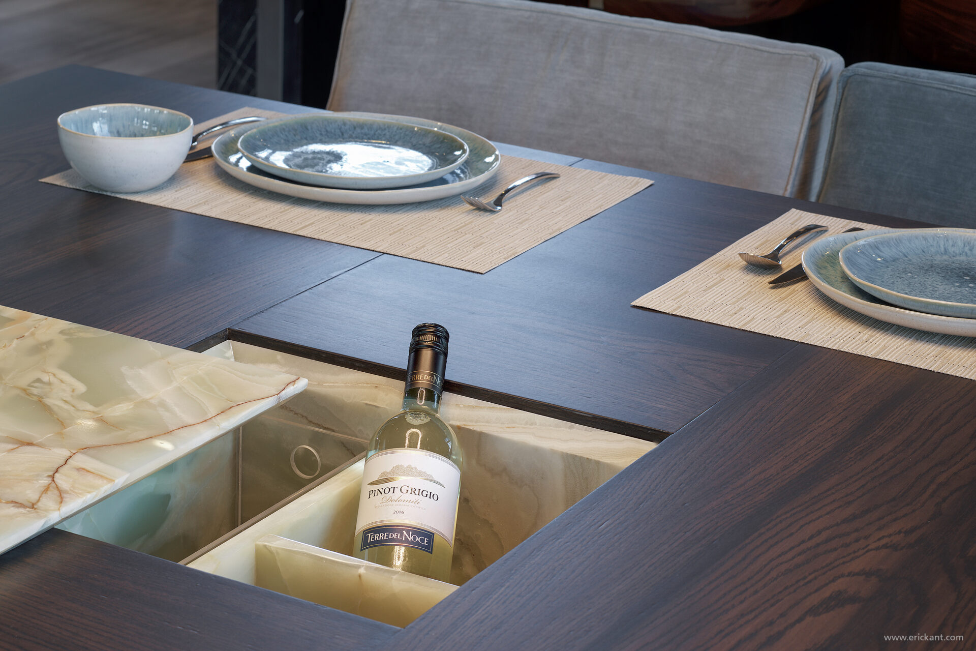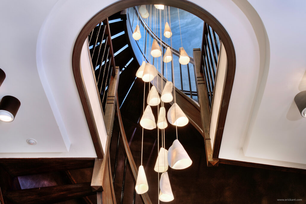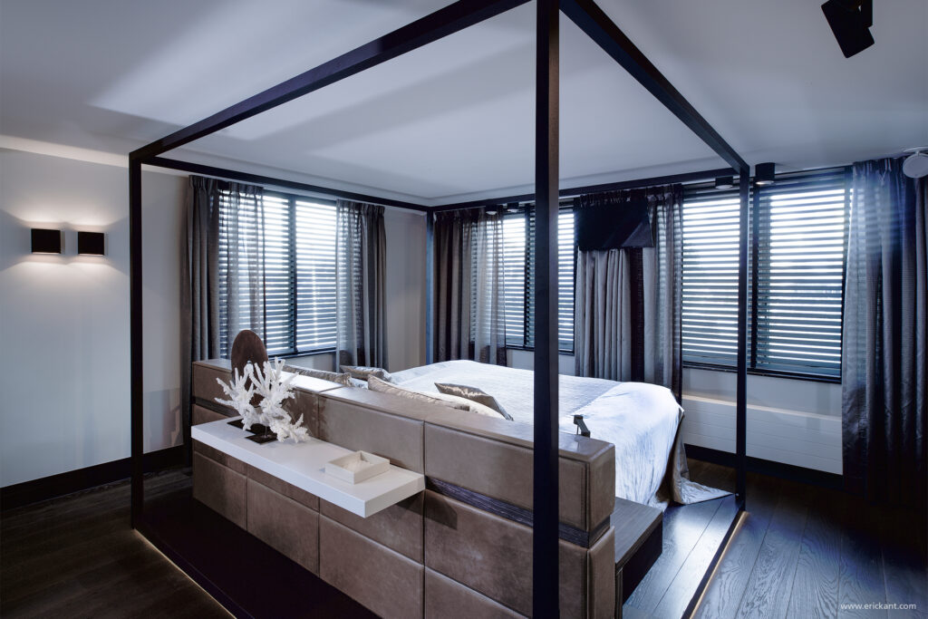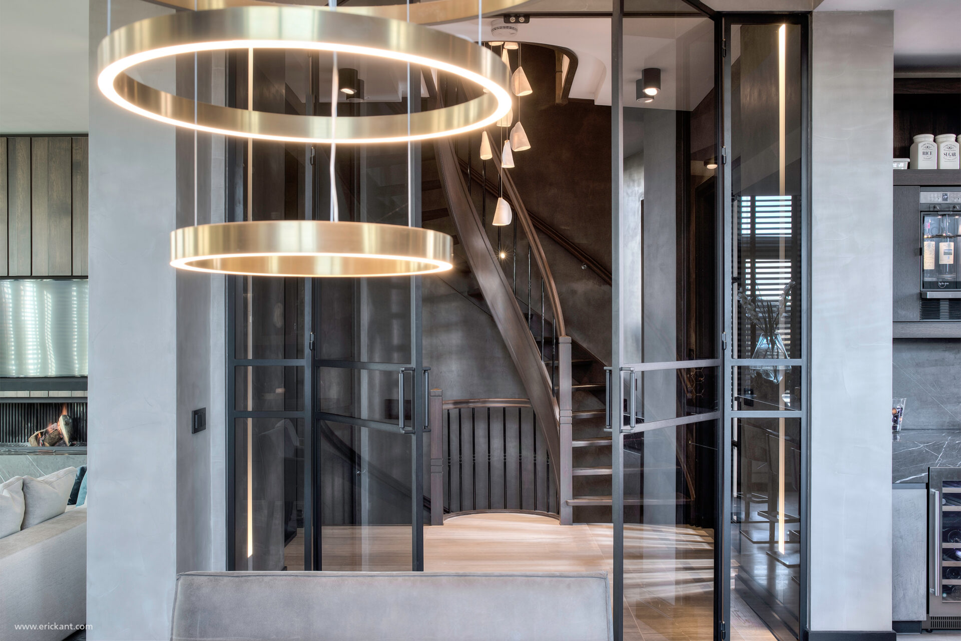 Het interieur kenmerkt zich door bijzondere en unieke details die de woning karakter geven. Zo is de oorspronkelijke muur tussen de keuken en eetkamer verwijderd, waardoor een vloeiende verbinding en interactie tussen de ruimtes ontstaat. Het trappenhuis kreeg een opvallende metamorfose met decoratief stucwerk op de wanden, een trap in een diepe, donkere tint en een imposante kroonluchter die de verschillende verdiepingen visueel met elkaar verbindt.
