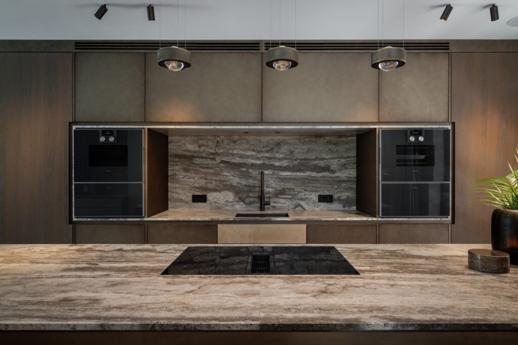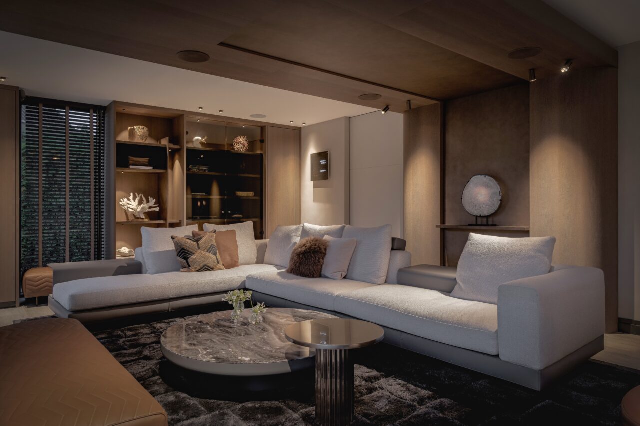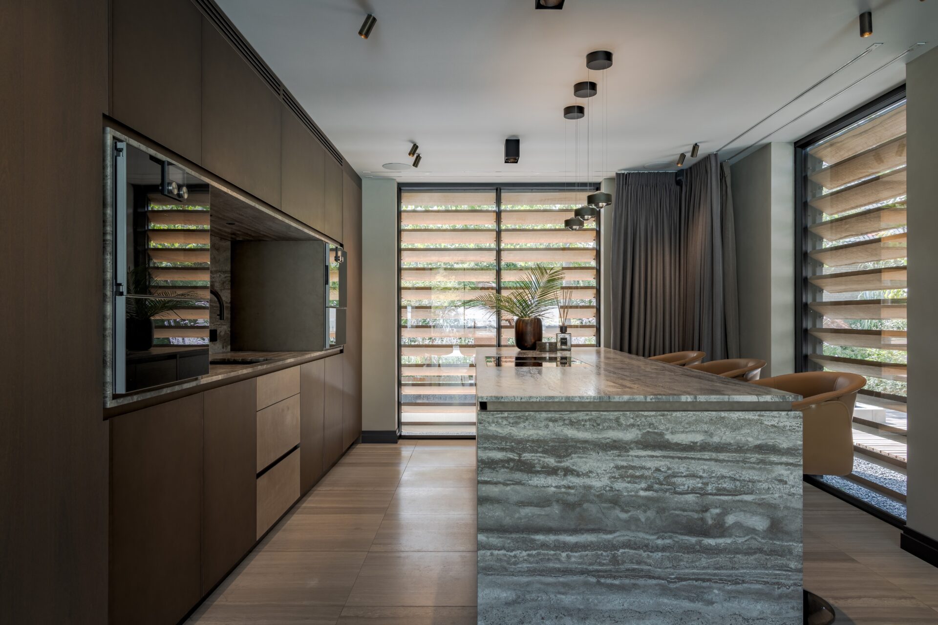 Centraal in deze woning ligt de ruime woonkamer waar een natuurlijke lichtinval samenkomt met een rustig kleurenpalet van verschillende bruintinten. Een lichte muurafwerking gecombineerd met donker houten accenten zorgt voor diepte en contrast zonder aan zachtheid in te boeten. De open keuken sluit aan op de leefruimte en is uitgevoerd met hoogwaardige materialen en verfijnde details die uitnodigen tot samenkomen. Deze droomwoning is een perfecte samensmelting van design en luxe. Elk detail is zorgvuldig gekozen en creƫert een unieke sfeer.