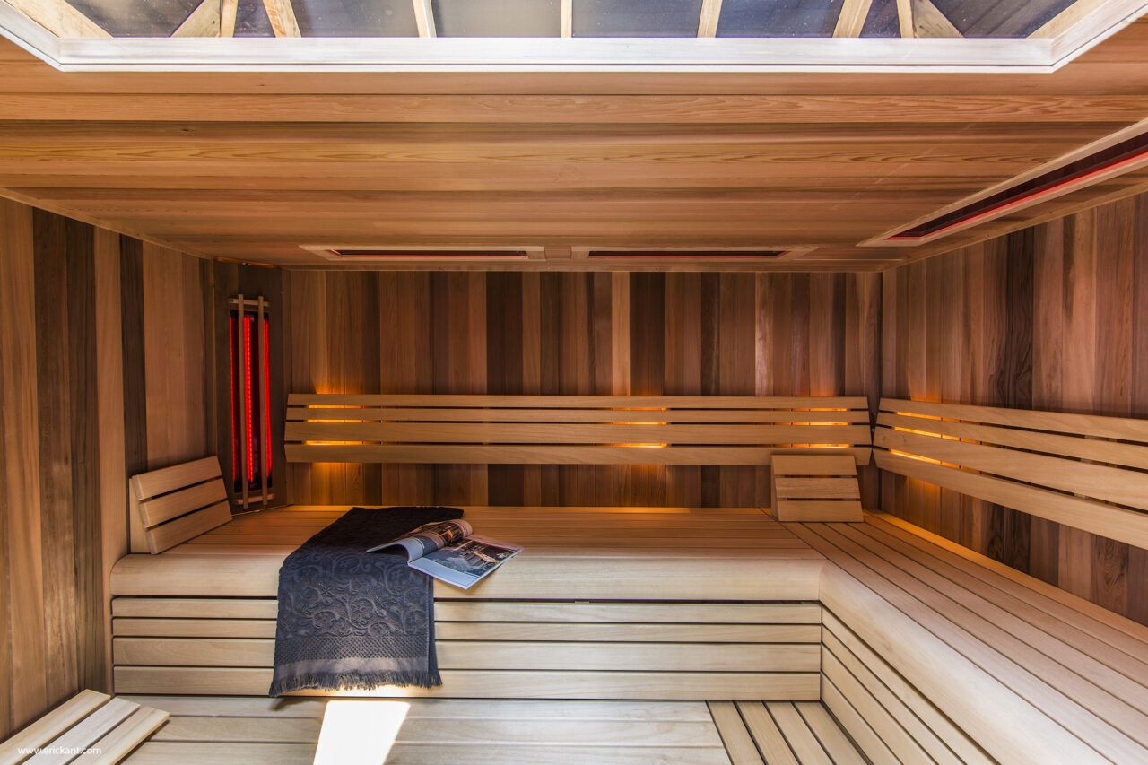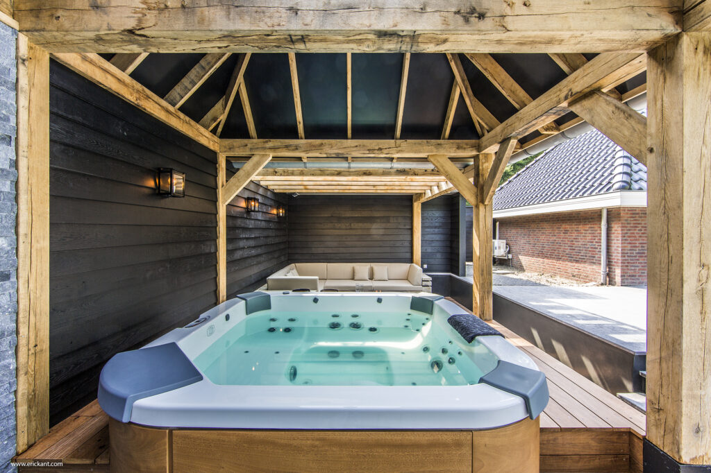 Centraal in deze wellness garden staat een jacuzzi met buitendouche, die wordt omringd door luxe loungeplekken, een sfeervolle buitenhaard en een modern paviljoen. Dit outdoor living design biedt ultieme ontspanning in eigen tuin. De infinity-pool creëert een doorkijk dat moderniteit uitstraalt.